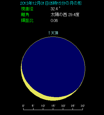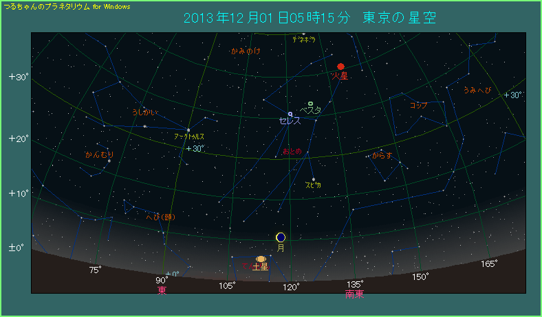 下の星図は12月1日5時15分の場合です。土星の高度は5.4度しかありませんが、17分前から早くも薄明が始まっており、この後空はどんどん明るくなっていきます。今回の接近はあまり条件が良くありませんが、今月末に再び月と土星が近づきます。こちらは条件が良いものですから、その前哨戦としてご覧になられてはいかがでしょうか。