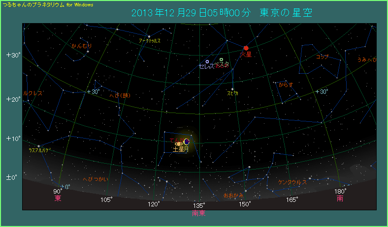 下の星図は東京で12月29日5時に南東の方角を眺めた場合です。月齢は25.8で、三日月よりも少し太った程度で細い目の月です。この左からやや下側、2.7度離れたところに土星が見えます。前回の接近では間隔が7度台と開いていたため、接近としては面白みが薄かったのですが、今回12月29日の場合は接近とよべる程度にまで近づきます。月が細いですから風情もあって楽しめそうです。
