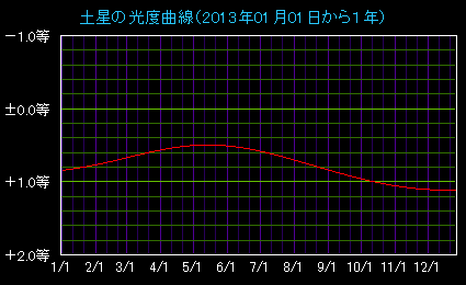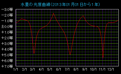 2013年の水星、金星、火星、木星、土星の光度曲線です。
