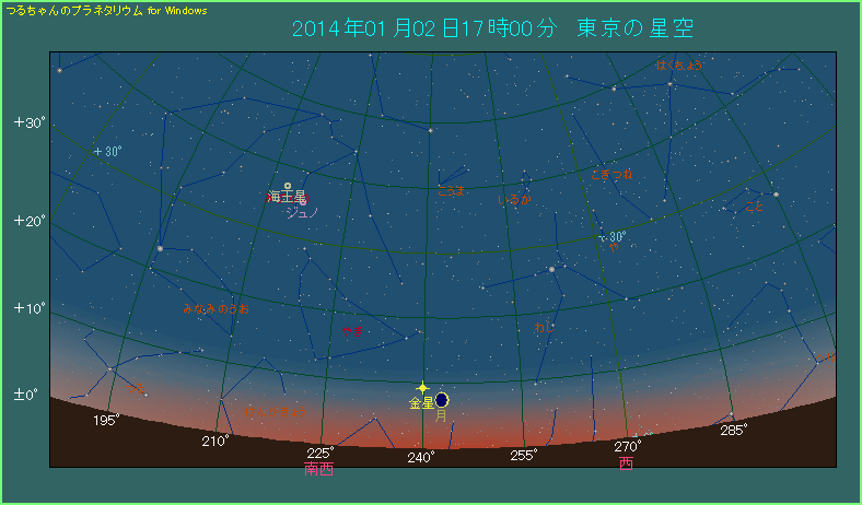 東京で月と金星の距離が最も近づくのは21時台で、このときは1.7度まで近づきます。しかし下の星図のように、17時頃だと3.6度の距離があります。10倍くらいの双眼鏡では同一視野に十分おさまりますから、新年早々、2つの天体の接近を楽しめそうです。