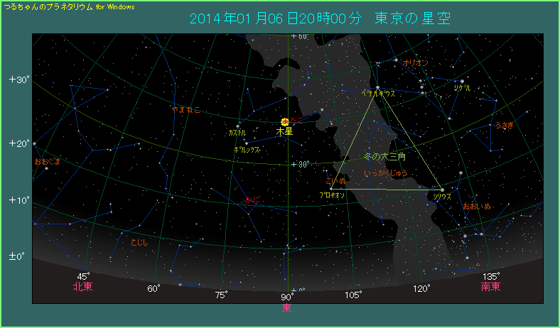 下の星図のように、1月6日20時頃ですと、木星はちょうど真東にあり、空の中ほどの高さに見えます。ふたご座のど真ん中に位置し、近くにはふたご座の明るい2個の星、カストルとポルックスもあります。もともとにぎやかな冬の星座にあって、ひときわ明るく輝いているのが木星です。東の空で最も明るく輝く星を探せば、それが木星なのです。