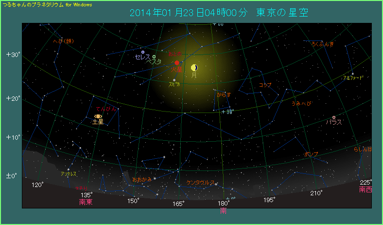 1月23日は月と火星が近づきます。火星は夜明け前の空で高度を上げており、4月14日の地球最接近を目指して観測条件が良くなってきているところです。元旦には西矩となっており、いよいよ火星も観望期入りといったところでしょうか。そんな折、1月23日に月齢21.3の半月よりも少し太い目の月が火星に近づきます。東京の場合で14時台に4度まで近づきますが、下の星図のように4時頃ですと、6.1度まで間隔が開いてしまっています。