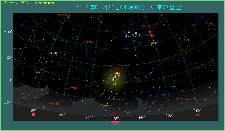 今月は月と惑星の接近をたくさん紹介してきましたが、その最後となるのが、1月26日に起こる月と土星の接近です。両天体が最も近づくのは1月25日の21時台(東京)で、0.8度強まで大接近します。しかしこのときは、まだ地平線上に昇っておらず見ることができません。星図のように、実際に見ることができる1月26日4時頃ですと、3.8度まで間隔が開いています。月齢は24.3で三日月と半月の中間くらいの太さです。土星はこの上方からやや右側にあります。明るさは1.1等ですから肉眼でも簡単に見つけることができます。