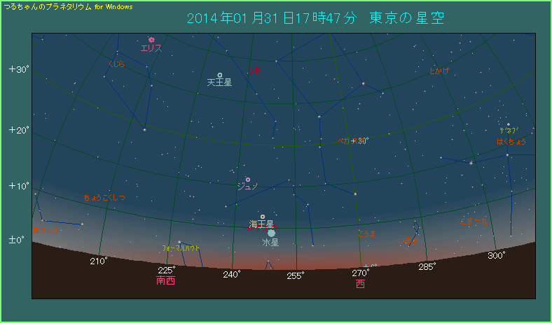 空の透明度が悪いときは肉眼だと難しいこともありますから、双眼鏡を用意しておかれたほうが良いでしょう。昨年のパンスターズ彗星やアイソン彗星をきっかけに購入された方がおられるかもしれませんね。水星観察では双眼鏡が役立ちますから、お忘れきようにお願いします。薄明の空を背景に、プツッと光る星が見つかれば、それが水星です。
