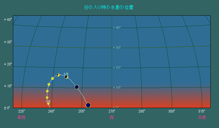 さて、日没から40分が経過した頃、西南西の方角をご覧ください。高度が10度足らずの低い位置で、-0.5等の明るさで光っているのが水星です。-0.5等で1等星より明るいといっても、薄明中の話です。周囲はまだ明るくて見づらい状態ですから、もう少しだけ時間がたって、空があと少し暗くなった頃がねらい目です。