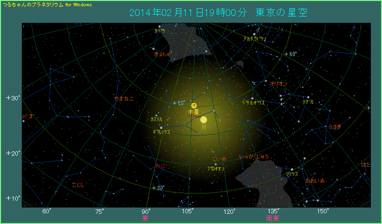 下の星図のように東京で19時頃ですと、両天体の間隔は5.9度あります。左隣で並んでいるふたご座のカストルとポルックスの間隔は4.5度ですから、それと比べるとだいぶ広い目です。今回は接近といえるほどではありませんが、月と木星、そしてカストルとポルックスの競演をご覧になられてはいいかがでしょうか。