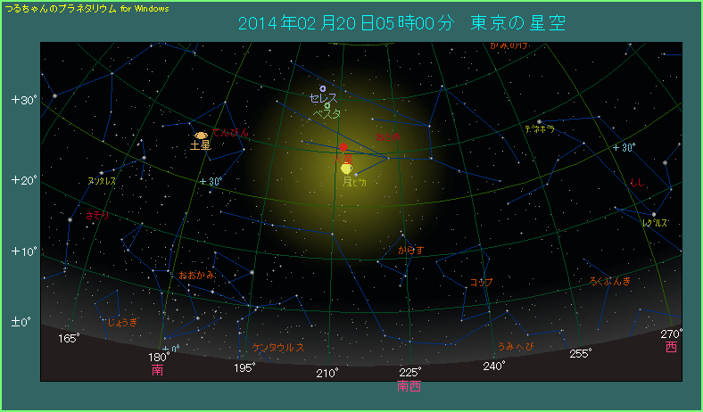最近は星座に対する火星の動きが小さくなっています。これは3月2日に順行から逆行に移る留となり、動く方向が変わる時期が近づいているためです。先月から火星とスピカは比較的近い位置にいましたが、2月3日には4.6度まで近づきました。そして現在も、近い位置にいる状態が続いています。そんなところへ2月20日に、月齢19.9の丸みを帯びた月が火星とスピカの間に割って入り、両天体に近づきます。