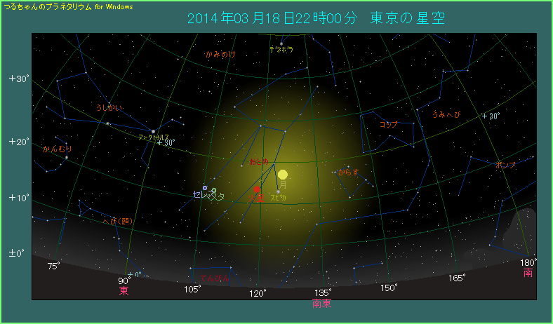 3月18日から19日かけて、月が火星とスピカの近くを通り過ぎ、三つどもえ状態になります。下の星図は3月18日22時ごろ、東京から見た南東の空のようすです。月とスピカの間隔は4.2度で近い位置にあります。また、火星とスピカは5.2度、月と火星は7.1度の間隔です。