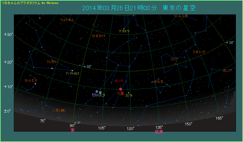 さらに下の星図をご覧ください。3月26日の21時ごろには、東南東の空で見ることができます。火星は4月14日に地球との最接近をひかえていることから、-1.2等まで明るくなっています。火星は独特の赤色をしていていますが、スピカは青白い色をした1等星です。両天体の色の違いも楽しみましょう。
