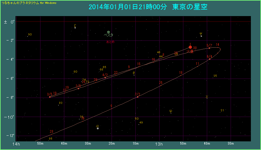 3月26日に火星とスピカが近づきます。こう言うと、「あれ? 火星とスピカは2月3日にも近づいたんじゃないの?」、と思われるかもしれません。その通りなのですが、2ヶ月弱たってから再度火星がスピカに近づきます。この理由は下の星図をご覧いただくと、すぐに納得できるでしょう。スピカは図の下の方、真ん中からやや左よりに「α」と書かれています。火星は宙返りをするような動きをみせており、2月上旬、3月下旬、7月中旬と3度にわたってスピカに近づくことがわかります。