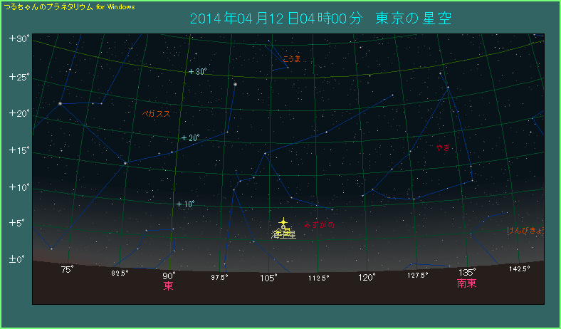 星図のように4時頃ですと、東京での高度は7度しかありません。おまけに3時42分から薄明が始まっていますから、決して良い条件とは言えません。空が明るくなる前に、手短かに観測をすませたいところです。