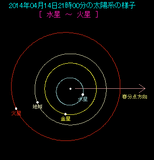 2014年は火星が地球に近づく年です。2年2ヶ月の周期で接近を繰り返す火星ですが、今回はいわゆる小接近です。下に示した太陽系の図をご覧になれば、その理由がおわかりいただけます。火星の軌道は太陽から中心がずれた楕円軌道ですから、火星がどの位置で地球へ近づくかによって、地球との距離が違ってくるのです。