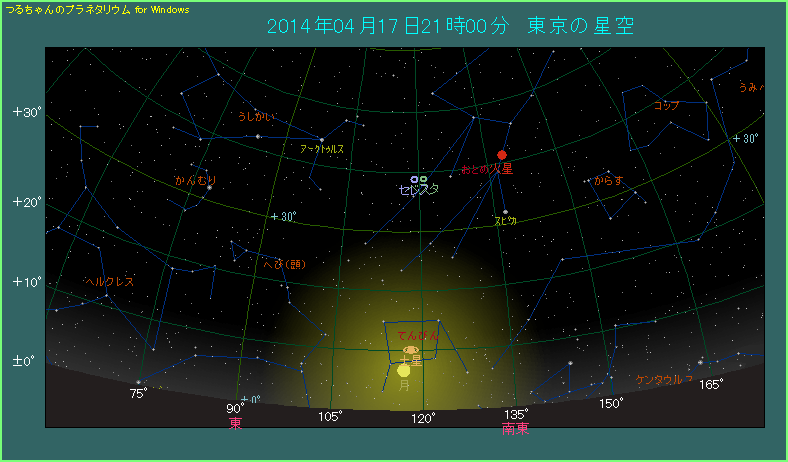 最近、月と土星が近づいたときの間隔が狭くなっていて、私たちを楽しませてくれます。今月も4月17日に0.6度強まで近づきます。しかし残念ながら、15時台ということで昼間の出来事ですし、地平線上に昇っていません。実際に観測できるのは、星図のように、月と土星が昇ってきた直後です。星図にある21時頃ですと、両天体の間隔は3.7度まで開いています。