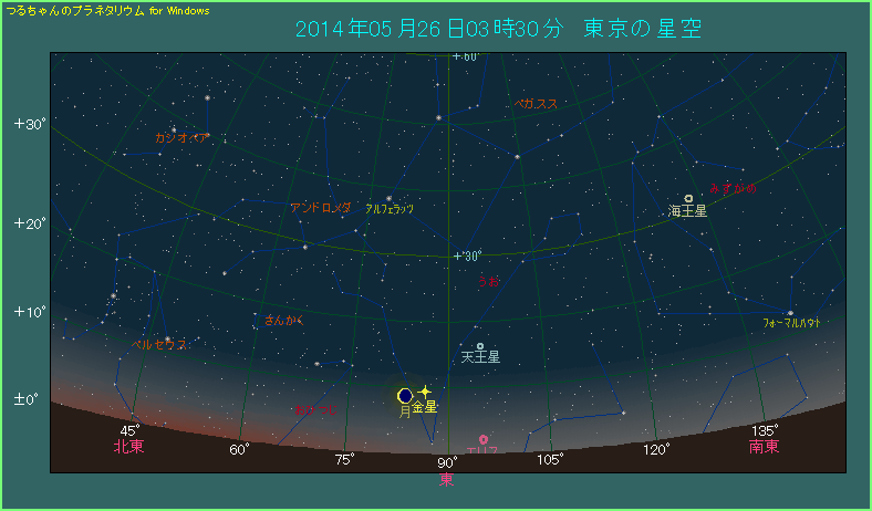 実際に観測することができるのは、下の星図のように5月26日の夜明け前です。東京で3時30分頃ですと東の方角に見えますが、10度足らずの高度しかありません。また、すでに薄明が始まっており、相変わらず、あまり好条件とはいえません。
