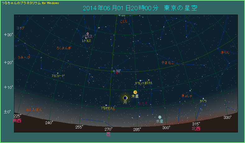 木星といえば金色に輝き、畏怖堂々とした姿を思い浮かべます。しかしこのところ、夕方の西空で高度が下がってきて人目につきにくくなっており、なんとなく元気がなさそうに思えます。最近はそんな木星ですが、6月1日は月が近づいて人目をひきそうです。といっても最も近づく14時台でも東京で5.7度の間隔ですから、接近としては大したことはありません。下の星図のように20時ごろですと、間隔は6.2度と、さらに広がっています。月齢は3.7の三日月で、木星はその右上に見えます。