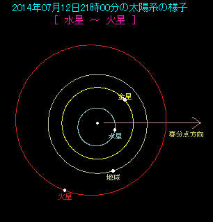 ところで東矩とは、惑星が太陽の東側へ90度離れて見えることです。下の図は7月12日の太陽系を表したものです。火星−地球−太陽が作る角度が90度になっていることがわかりますね。