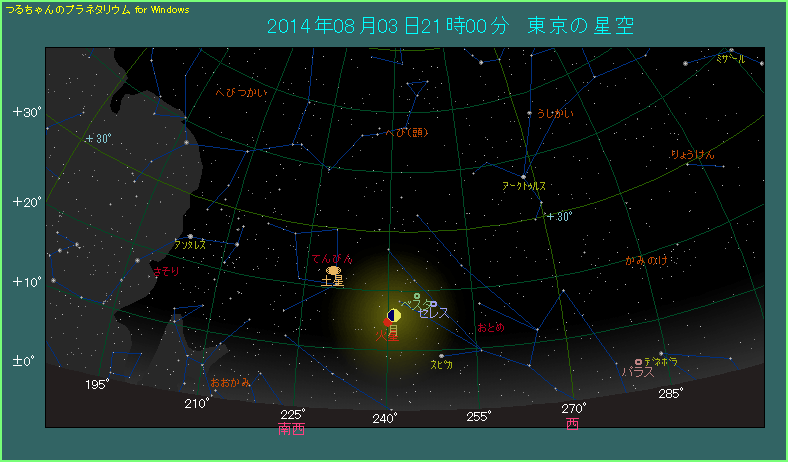 8月3日は月と火星が1.4度まで接近します。先月の7月6日は東京で0.1度を切るところまで近づきましたし、先々月の6月8日は1.9度まで近づいたはずでしたが、残念ながら地平線下で見ることができませんでした。しかし今回は、最も近づくのが東京の場合で21時01分です。下の星図のように最も近づいた時間帯に見ることができるのでラッキーです。