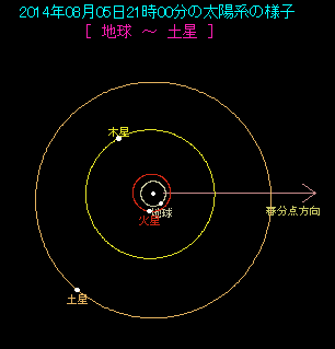 土星は5月11日に衝となってから、見やすい時間帯に活躍してきましたが、8月5日に東矩を迎えます。東矩とは、惑星が太陽の東側へ90度離れた位置にやってくることです。下に示した太陽系の図をご覧になると、太陽、地球、土星が作る角度が90度になっており、東矩であることがわかります。