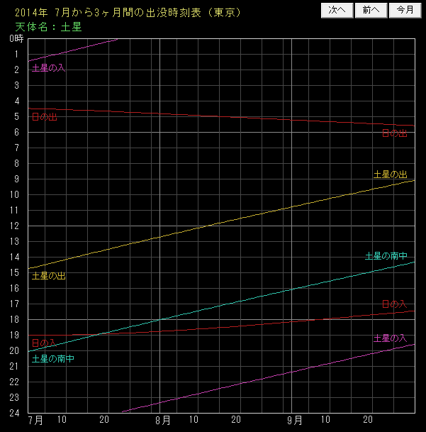 東矩の頃は、日の入り頃に惑星が南中します。「つるちゃんの天体出没時刻表」で作成した下のグラフを見ると、土星の南中は日の入りよりも1時間弱ほど早くなっています。これは、夏場は日の入り時刻が遅いためです。