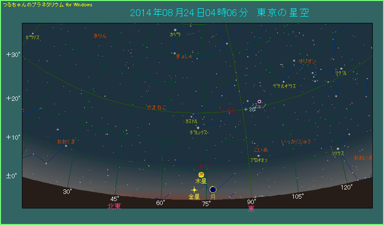下の星図は8月24日、東京での日の出から1時間前における東天のようすです。地平線近くで月と金星と木星が、三角形に並んでいるのがわかります。金星と木星は5.7度、金星と月は6.3度、木星と月は6.5度、それぞれ離れて並んでいます。正三角形に近くて美しいでしょう。