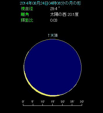 意外に思われるかもしれませんが、3つの天体の中で、最も見つけにくいのは月です。月というと明るいと思われがちですが、月齢は27.8で、翌日が新月という糸のように細い月です。肉眼では厳しいかもしれませんから、双眼鏡を用意しておかれた方がいいかもしれません。