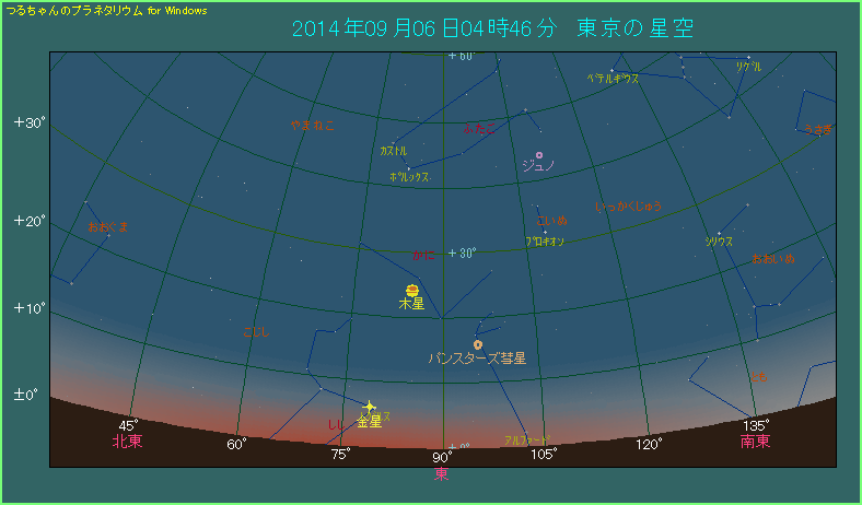 2014年の金星は、夜明け前の東天で高度があまり上がらず、8月に入ってからは高度を下げ始めました。そして9月上旬ともなると、日の出時刻における金星の高度は10度を少し超えた程度しかありません。そんな状態で9月6日に、しし座の1等星レグルスへ大接近します。