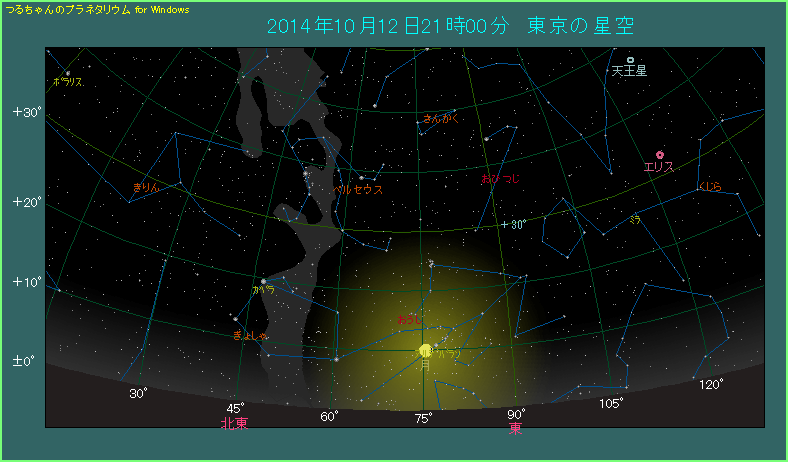 10月12日は月とアルデバランが接近します。アルデバランといえば、おうし座で光るオレンジ色をした1等星ですね。おうし座は冬の星座のトップバッターの一つですから、この時期の21時ごろでは、まだ東の空から昇ってきたところです。