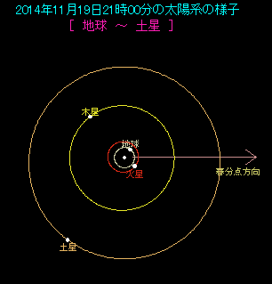 11月19日に土星が合となります。合とは惑星が太陽と同じ方向にやってくることです。下に示した太陽系の図をご覧ください。地球から見た土星は太陽と同じ方向に位置することがわかります。太陽と同じ方向ですから当然、土星を観測することはできません。 この後しばらくすると、土星は夜明け前の空に姿を現すようになります。それまでしばらくの間、土星の天体観測はお休みですね。