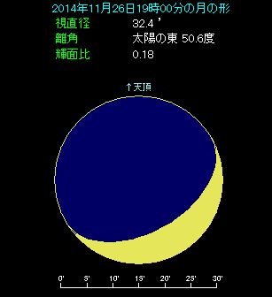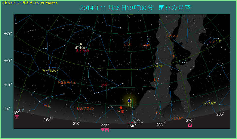 月と火星は毎月のように近づいていますが、8月3日の接近以降、日本から良い条件で見られる接近はありませんでした。11月もその例外ではありません。下の星図のように、11月26日夕刻に月と火星が近づきますが、東京19時の場合で間隔が6.2度も開いています。おまけに火星の明るさも1.0等と、ひと頃よりも光度が落ちています。とはいえ、月齢は3.9で細くて美しいですから、この機会にご覧になられてはいかがでしょうか。