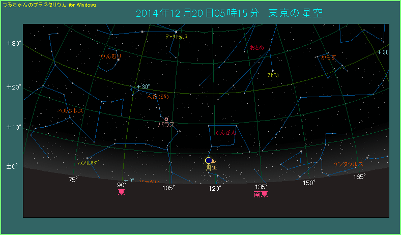 下の星図は日の出から1時間半前に南東方向を眺めたものです。ちょうど空が白み始めるタイミングですから、観測は手際よく済ませなければなりません。土星の高度はこの時点で7.6度しかありませんから、南東方向が開けた場所からご覧になる必要があります。