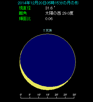 月齢は27.3で細いものです。低空ということもあって少々見づらいですが、地球照によって月全体がほんのりと浮かび上がって、非常に美しいでしょう。土星との間隔も狭いですから、接近ファンの方は期待していただいてよさそうです。