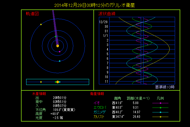 68.0分間にわたってガニメデがイオを掩蔽します。また、11.3分間にわたって皆既となり、イオは完全に隠されてしまいます。減光率は49%で、0.73等だけ暗くなります。