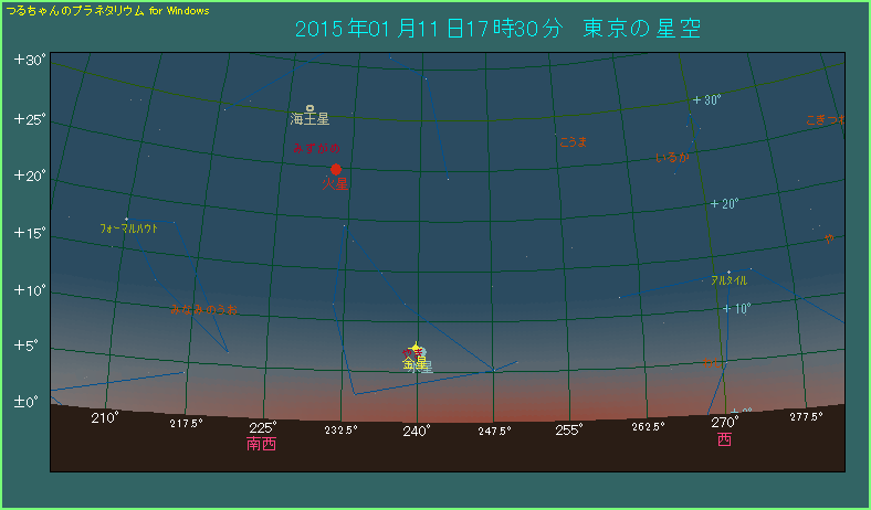 下の星図は1月11日、東京で日の入りから43分後、17時30分ごろのようすです。両惑星の間隔が0.65度と大変狭いので、いつもの星図より拡大しました。高度が低いため実際に見られる際は、西から南西の方角が開けた場所でご覧ください。