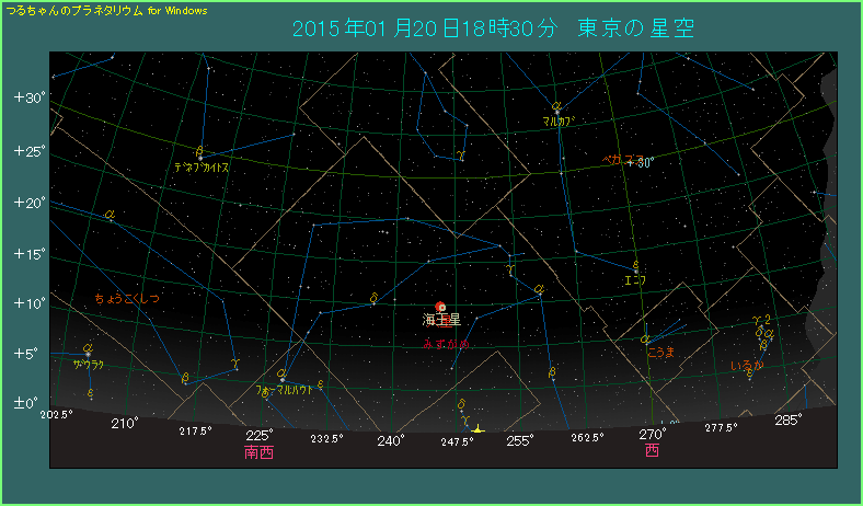 下の星図は1月20日の18時30分ごろ、東京から見た西南西の空のようすです。この日、東京で空が完全に暗くなるのは18時24分ですから、下の星図はその直後ということになります。火星の高度は15度あまりと決して良い条件ではありません。海王星は8等級と暗いので、見るだけでも天体望遠鏡が必要になります。幸い火星は1.2等と明るいですし、両惑星の間隔は21.5分(=0.36度)しかありませんから、火星を導入するだけで海王星をたやすく見つけられます。前日も30.5分(=0.55度)と大接近状態ですから、19日にご覧になってもよいでしょう。