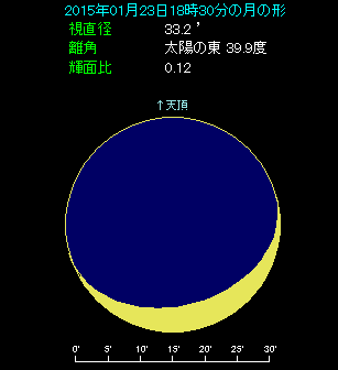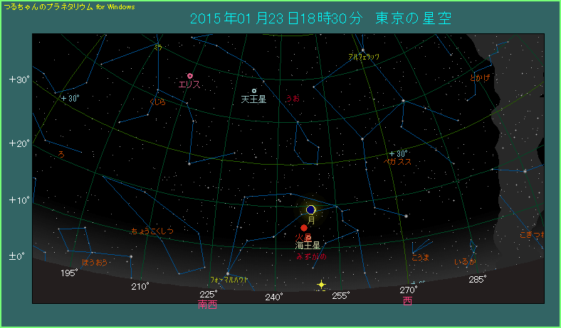 下の星図は1月23日の18時30分ごろ、西南西の空のようすです。東京では空が完全に暗くなった直後で、いちおう暗夜で観測することができます。月齢は2.8ということで、三日月です。火星は月の下方向からやや左側、4.6度離れたところで並んでいます。1.2等とそこそこ明るいですから、はっきり見えて楽しめるでしょう。