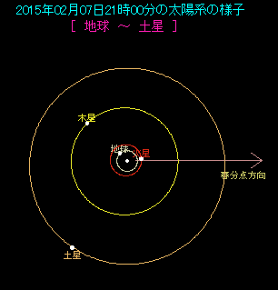 2月7日は木星が衝となります。衝とは惑星が太陽から180度離れることです。太陽系を示した図をご覧ください。地球から見た木星は、太陽とちょうど反対側にあり、180度離れていることがわかります。衝のころの外惑星は地球へ近づくうえに、太陽と反対側にあるため一晩中観測することができて、観測条件が最良となります。