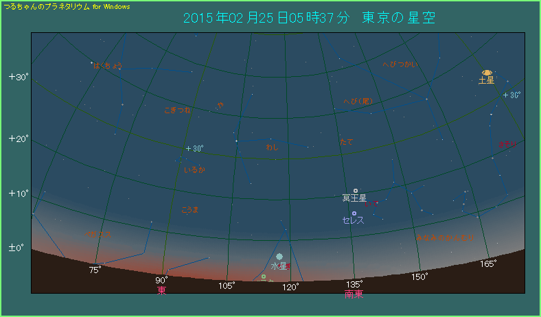 水星は2015年に入ってから、1月15日に東方最大離角となりました。それに続いて2月25日に、今年初めて西方最大離角となります。しかし今回は条件が悪く、日の出前の水星の高度は高くなりません。