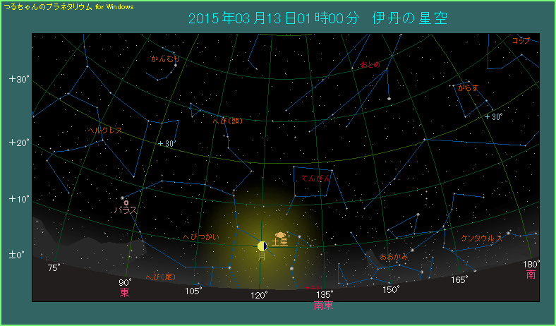 下の星図は3月13日1時ごろ、南東の空のようすです。両天体が最も近づくのは12日の17時台ですが、このときはまだ地平線下にあります。星図はそれから8時間あまりが経過していることから、間隔が5度まで広がっています。時間がたつほどさらに間隔が広がっていきますから、13日に日付が変わったら、なるべく早い時刻に見られた方がよいでしょう。