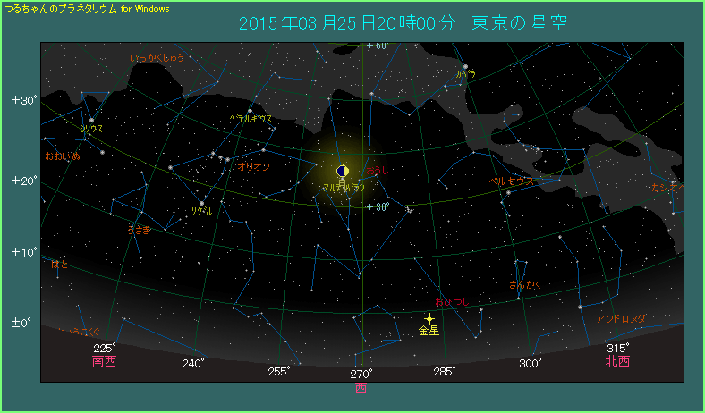 下の星図は20時ごろ、西空のようすです。東京では空が完全に暗くなった状態です。月はほぼ真西にあり、半月よりもちょっぴり細い目です。月の右下方向が光っており、アルデバランは月の下側にあります。アルデバランといえば、おうし座でオレンジ色に輝く1等星ですね。両天体が1.6度まで接近したようすを楽しんでください。