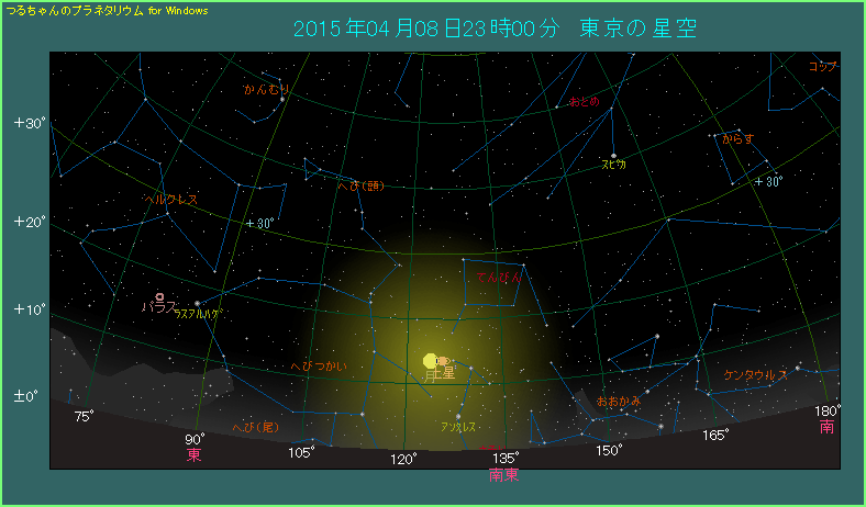 下の星図は4月8日23時ごろ、南東の空のようすです。月と土星が東の空から昇ってきて1時間ほどが経過したところです。最も近づくのは21時過ぎごろですから、今は次第に間隔が広がってきているところです。星図にある23時ですと、その間隔は東京で2度くらいですから、十分に接近とよべるものです。月齢は19.2と月が太い目ですが、両天体が横に並んだ姿は興味深いものがあります。ご覧になってみてください。