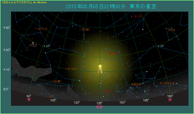 こどもの日の夜、月が土星に近づきます。下の星図は5月5日の22時ごろ、東京から見た南東の空のようすです。高度20度ちょっとのところに月齢16.8という、だいぶ太った月があります。この下側に1.0等で光る土星が見えます。両天体の間隔は1.8度強で、いい感じの接近状態です。