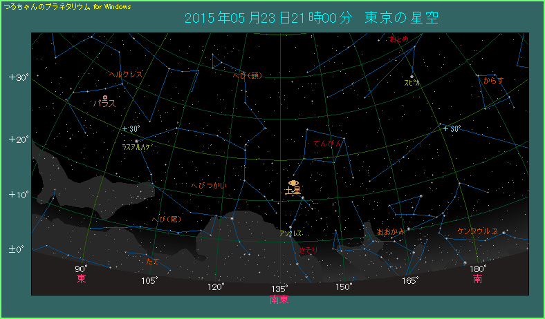 ところで今、土星はてんびん座にあります。といっても、さそり座との境界付近です。5月23日の21時ごろですと、南東の空で比較的低い位置に見えます。東京くらいの緯度では南中高度が36度と低いですから、大気の影響を受けやすく、望遠鏡を使った観測には不利な条件です。大気が落ち着いた日をねらって観測しましょう。肉眼で見た土星は鈍い黄土色をして1.0等で光っていますから、すぐにそれとわかります。