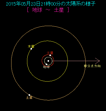 観測条件が悪くなる木星に代わって、条件が良くなるのが土星です。土星は5月23日に衝となって観測条件が最も良くなります。衝とは惑星が太陽から180度離れた位置にやってくることです。つまり、太陽と反対側に見えるわけですから、一晩中観測できることになります。また、下に示した太陽系の図をご覧になるとわかりますが、土星は地球から最も近い位置にあります。こちらの意味でも観測条件が最も良いと言えます。