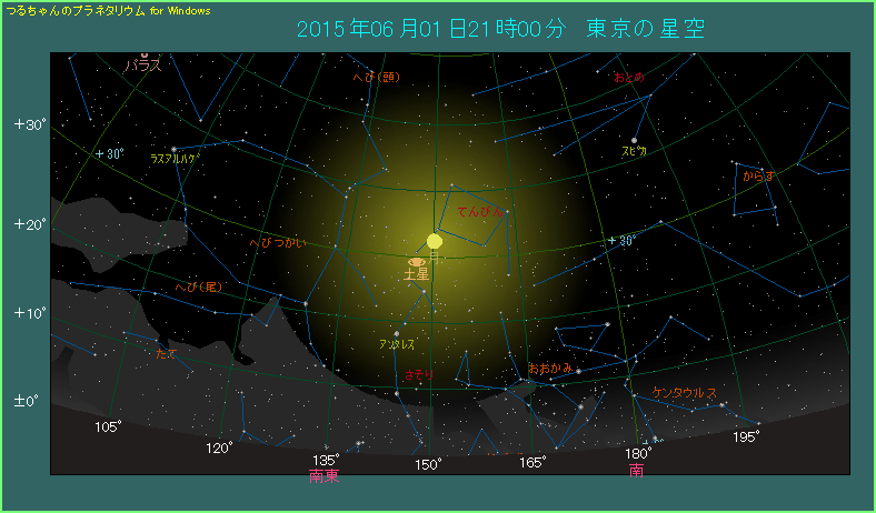 今月も月と土星の接近記事からスタートです。下の星図は6月1日の21時ごろ、南東の空を見上げたようすです。満月2日前の大きな月の左下に、1.0等の土星があります。21時の場合は4.1度の間隔で並んでいます。最も接近するのが翌日2日の日の出後ということもあって、2日の0時だと3.1度、3時だと2.1度いった具合に、この後間隔が次第に狭くなっていきます。