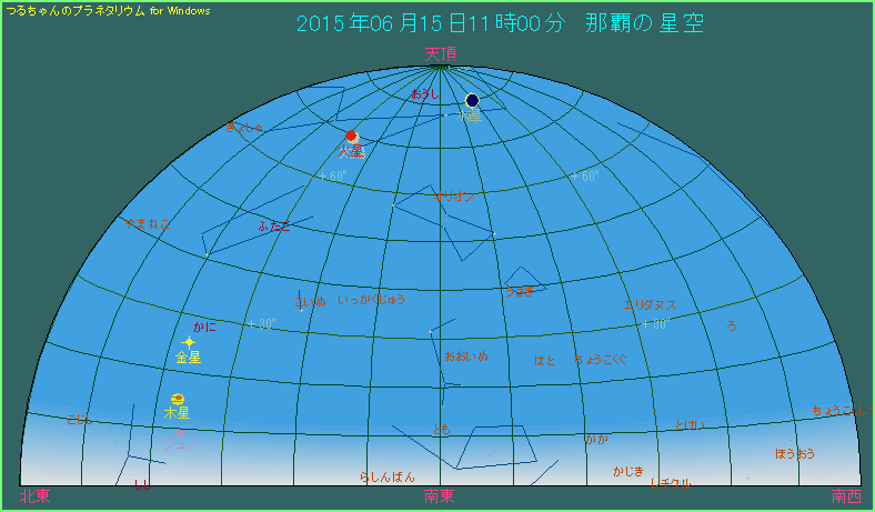 6月15日の日中、鹿児島県南部よりも南の地域で水星食が見られます。那覇の場合ですと、潜入は11時9分、出現は12時14分で、お昼前後に起こります。月の高度は80度という天頂に近い位置でスタートします。月齢が27.9で、月が非常に細いうえに、太陽からの離角も19.5度しかありませんから、探すのはかなり大変でしょう。導入の際は赤道儀の目盛環を使うなどして、誤って太陽を視野に入れないように最新の注意を払ってください。