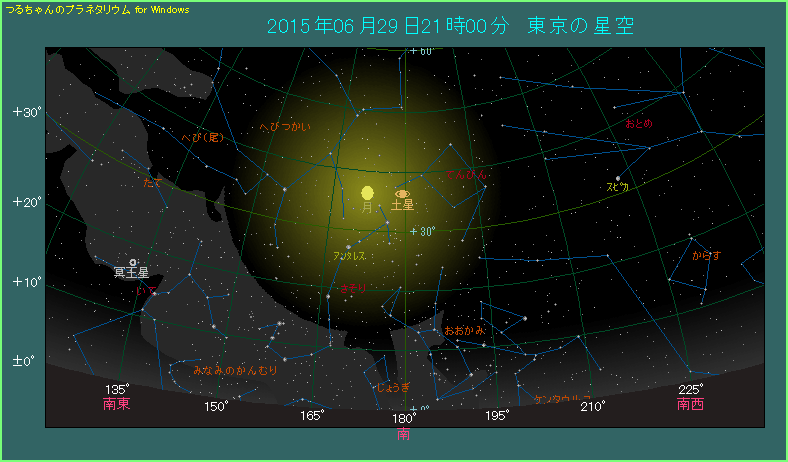 6月29日は月と土星が近づきます。これは6月1日に続いて、今月2度目の接近です。今回、両天体が最も近づくのは6月29日の10時台で、1.7度まで近づくのですが、夜間時間帯から大きく外れています。そのせいで、下の星図にある21時ごろでは、間隔が5.9度まで広がっています。今回は条件があまり良くありませんが、今月2度目ということで、いちおう紹介しておきました。
