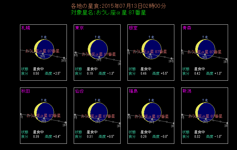 だいぶ前置きが長くて難しくなりました。今回7月13日のアルデバラン食は、潜入と出現の両方を観測できるのは、北海道の北東側半分だけです。また、出現のみを観測できるのも、東日本と北日本だけに限られます。東京の場合ですと、出現は2時10分ですが、月の出は2時4分。月の出直後にアルデバランが月の縁から現れますから、条件的には最悪です。比較的条件が良い札幌でも、出現は2時24分であるのに対して、月の出は1時41分。出現時の高度は7度を切ってしますから、あまり条件の良いものではありません。