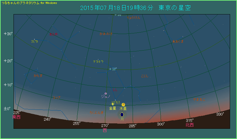 まず7月18日ですが、金星と木星が横に並んだところへ、木星の下側に月がやってきます。下の星図は19時36分ということで、東京で日の入りから40分が経過しています。まだ薄明中で、西の空は明るい状態です。月は月齢2.4と細いですから、肉眼で見つけるのは骨が折れるかもしれません。金星と木星の間隔は5.8度で、月と木星は5.5度です。