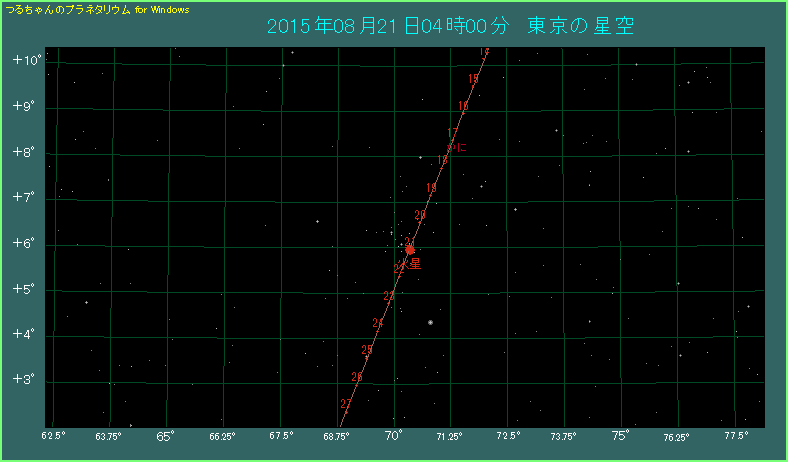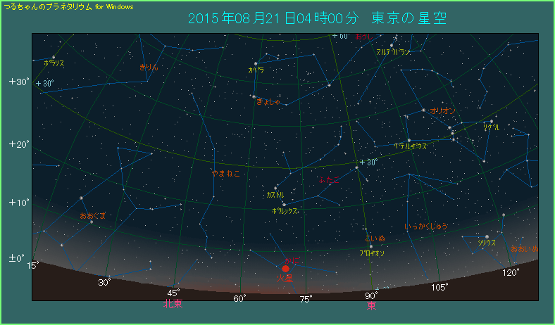 下の星図は8月21日の4時ごろ、東京から見た東空のようすです。低空に1.8等の火星があります。プレセペ星団との間隔は最も近づいたときで0.5度ですが、星団の直径は1.5度以上もあります。大接近というよりも、火星がプレセペ星団の中に入り込む格好です。薄明が始まる低空で観測しづらいですが、双眼鏡か天体望遠鏡を使えば、観測できるのではないでしょうか。お持ちの方は挑戦してみてください。