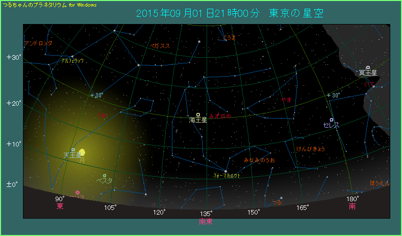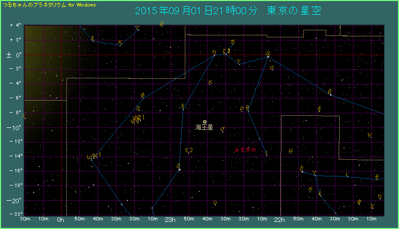 海王星は9月1日に衝となります。通常ですと「衝になった惑星は地球に近づいて観測条件が良くなり・・・」、と書くところなのですが、いかんせん、海王星は遠すぎます。衝になったところで地球との距離があまり変わらず、たいして観測条件が良くなるわけではありません。しかし、真夜中に南中することから一晩中観測できて、こちらの面では多少観測条件が良くなります。